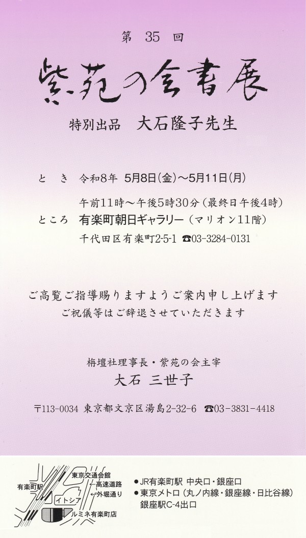 第34回 紫苑の会書展 2025年4月25日 最終更新日時 : 2025年10月2日 staff 2025年5月30日(金)~6月2日(月) 本院顧問 大石三世子先生が主宰される紫苑の会の第34回 紫苑の会書展 が開催されます。 ◷ 2025-04-25