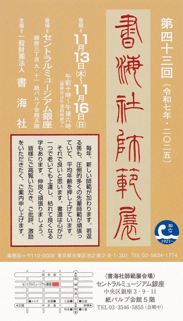 第43回 書海社師範展 2025年10月17日 最終更新日時 : 2025年10月20日 staff 2025年11月13日(木)~11月16日(日) 本院所属団体 書海社 主催第43回 書海社師範展 が開催されます。 ◷ 2025-10-17